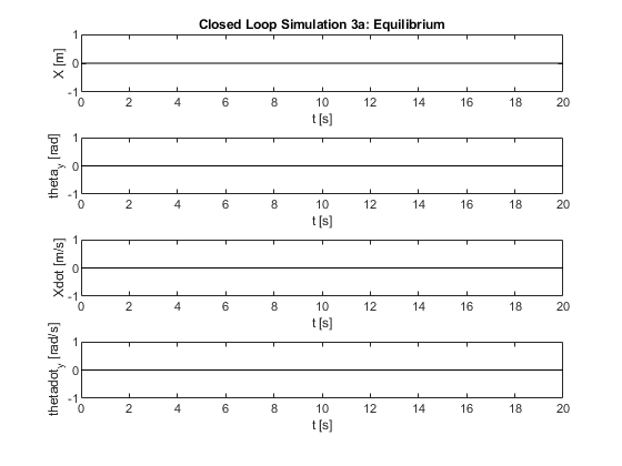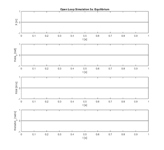 For this lab I took the system of equations established from Lab0x05: Feeling Tipsy? Documentation and developed an open and closed loop model of the ball/platform system. (Please note that my equations from Lab 5 were wrong, so in order to stay up to date, I used Charlie Refvem's matrices posted on piazza here https://piazza.com/class/kjgexlriphb1od?cid=52). I began by linearizing the equations by uncoupling the set of nonlinear second-order equations into an uncoupled set of linear first order equations using Jacobian linearization. Once linearized, I used MATLAB to create an open loop simulation for the system which took inputs for x, theta_y, xdot, thetadot_y, and T_x. Finally, I modified the matrices to create a closed loop simulation that uses K = [-0.05(N-s) -0.02(N-m-s) -0.3(N) -0.2(N-m)] as the controller.