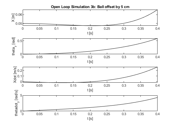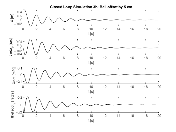 - The ball offset by 5cm: This series of plots demonstrates what we would expect. The ball starts at 5cm but because of the no slip condition, it rotates towards the center of the platform. After that, the controller facilitates the motion to rotate the platform to balance the ball. We can confirm this by comparing the theta_y and X plots. When X deviates from the center, the platform is rotated in the opposite direction to compensate. This process is repeated until the ball comes to equilibrium. Since the controller is made up of arbitraty values, there is significant overshoot and the ball does not stabilize for over 10 seconds.