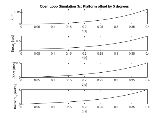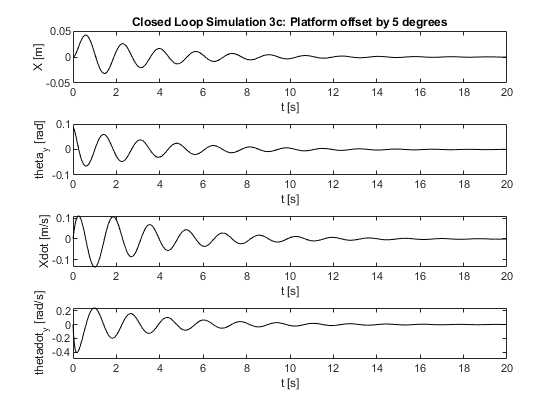 - The platform offset by 5degrees: This series of plots demonstrates what we would expect. It follows the same trend as the open loop model. The platform is initially rotated 5 degrees from vertical and the ball moves accordingly. Then the controller attempts to correct this until the ball stabilizes.
