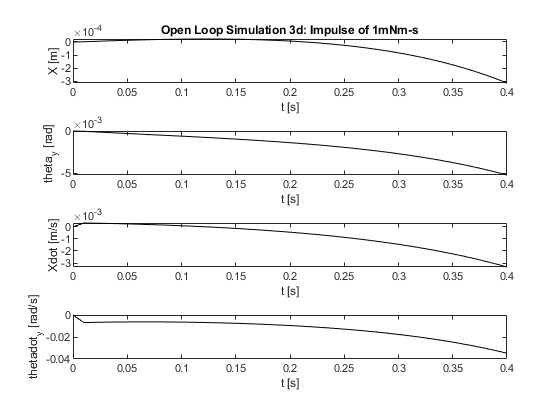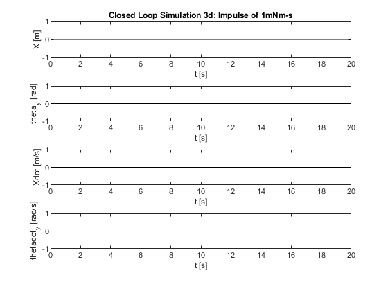 - A 1 mN-m-s impulse applied to the motor: This series of plots demonstrates what we would expect. Since our controller effectively overrides any inputs (motor torques), the impulse would be irrelevant. The result is no motion from the system.